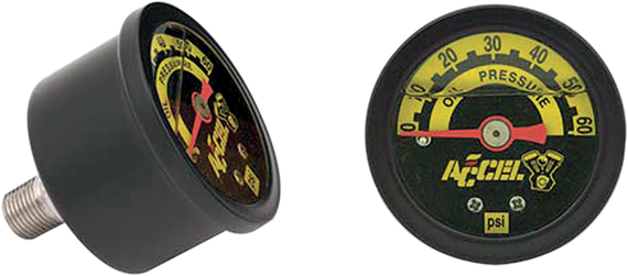 Caracteristicas: 1/8" NPT rear mount oil pressure gauges Stainless steel housing with a black anodized finish Solid brass internals are bathed in a vibration damping glycerin for accuracy 60 or 100 PSI