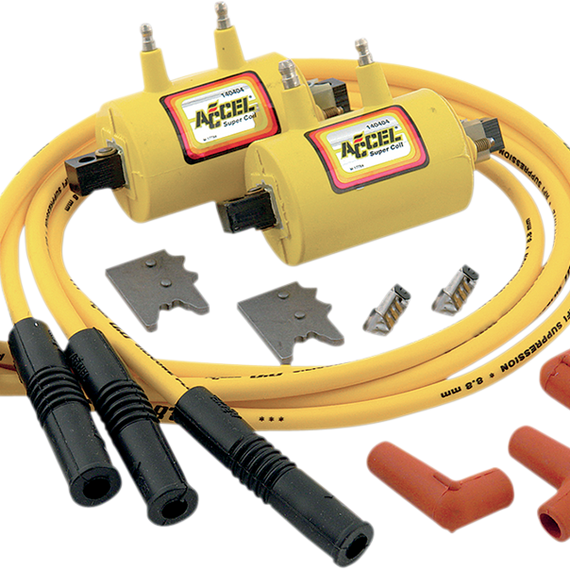 Caracteristicas: High-output coils for use in 2 cylinder motorcycles ACCEL engineers designed these coils' special low-resistance primary winding to match the operating characteristics of factory and aftermarket CDI systems Maximum performance with fast rise times Extra-heavy-duty 8.8mm silicone wires included Made in the U.S.A. Using the wrong coil may damage your motorcycle's electronic ignition module. To determine your ignition type, complete the following test: 1. Determine whether the type of coil you are replacing is a high tower coil. (These coils will NOT replace single tower coils.)2. Using a volt meter or 12V test light, hook the positive lead to the positive post and the negative lead to the ground on one of the stock coils.3. Turn the ignition on, but DO NOT engage the starter button.4. If there are 12V at the coil, the motorcycle has an inductive type ignition. If there is no voltage at the coil, then the motorcycle has a CDI ignition because the power goes to the control box first.