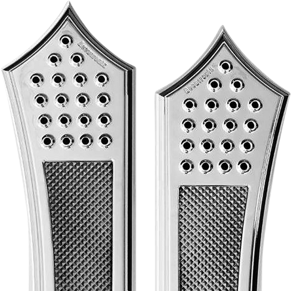 Caracteristicas: Replace the stock OEM front floorboards for a more custom look Extended 63.5 mm (2-1/2") in the front, and 19 mm (3/4") wider and 25.4 mm (1") longer in the rear Mounts like stock with stock hardware Machined with 6061 T-6 billet aluminum The top portion of the board has a raised hole feature inspired by racing pedals The lower area is a multi-directional, slip-resistant Machined Pyramid-Top Knurled design