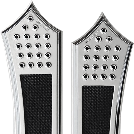 Caracteristicas: Replace the stock OEM front floorboards for a more custom look Extended 63.5 mm (2-1/2") in the front, and 19 mm (3/4") wider and 25.4 mm (1") longer in the rear Mounts like stock with stock hardware Machined with 6061 T-6 billet aluminum The top portion of the board has a raised hole feature inspired by racing pedals The lower area is a multi-directional, slip-resistant Machined Pyramid-Top Knurled design