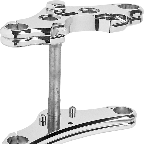 Caracteristicas: Chrome-plated CNC-machined T-6 billet aluminum with Elite design Standard (0°) rake with top OEM style headlight mount style Kits include upper and lower trees, stem with nut, fork stop, axle with spacers, fender and single-disc spacer Accept stock fork assembly, front fender, front wheel and headlight Neck post bearings and races are not included Made in the U.S.A.