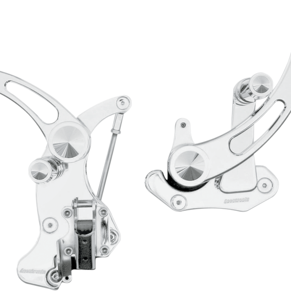 Caracteristicas: CNC-machined from 6061 T-6 aluminum 3/4" mounting plates for superior strength Feature sealed bearings on the pivot points for smooth operation and no maintenance Assembled with chrome hardware, kit comes ready to install Used with existing stock master cylinder Includes foot and toe pegs, mounting hardware and instructions Made in the U.S.A. When installing extended forward controls, check fender clearance before operating.