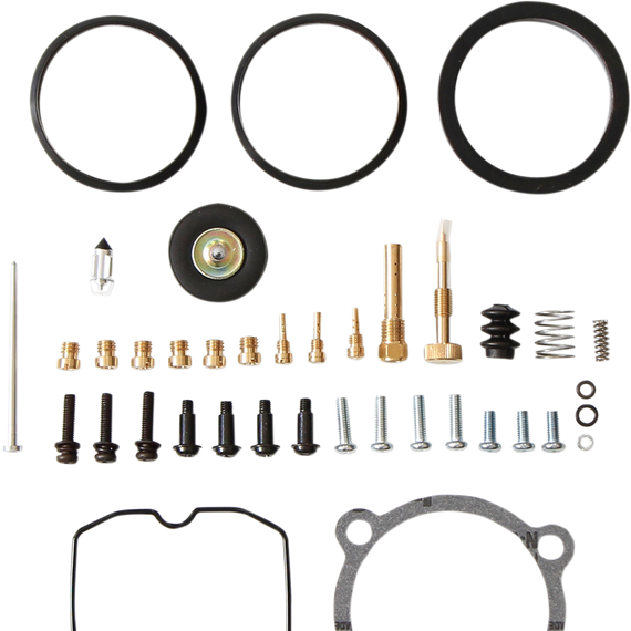 Caracteristicas: Components included in the kits are based off of U.S. models and discretion must be used when attempting to install the kit on a non-US model Kits include float bowl, carburetor cap, and accelerator pump screws Extended fuel mixture screw with spring, washer, and O-ring NBR rubber material is used on all O-rings and rubber gaskets; NBR has excellent resistance to the ethanol used in today’s fuels Three main jets and three pilot jets that can be used to  tune a stock machine or a modified one All gaskets and O-rings including intake gaskets  before and after the carburetor Accelerator pump diaphragm spring and boot Kits are intended for closed-course racing only Float needle valve with FMK tip Emulsion tube with slide needle