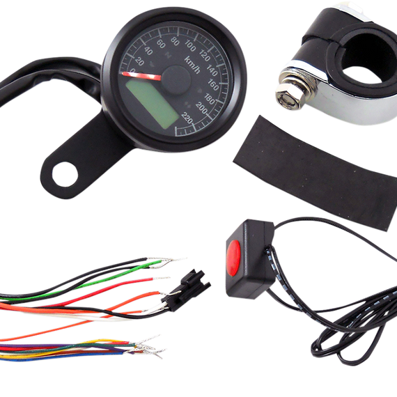 Caracteristicas: Programmable with any sending unit that sends 3,000 - 90,000 pulses per minute Gauge bezel measures 1-7/8" in diameter Overall length is approximately 2" L Feature a 12V LED backlit display Digital odometer and dual trip meters Indicators for high beam, neutral, oil pressure and turn signals Remote single-button switch allows easy changing between odometer and trip meter Color-coded wires and detailed wiring instructions Includes chrome mounting clamp for installation on 7/8" to 1-1/4" diameter tubing Mileage cannot be reset on speedometers