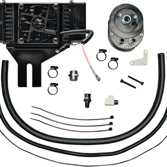 • Kits include oil cooler, oil hose, mounting hardware, automatic thermal fan switch wiring harness, Jagg offset oil filter adapter and hose clamps