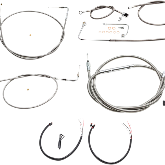 Caracteristicas: Take "cable calculation" headaches out of swapping handlebars Kits give you the correct length cables, brake lines and wire extensions you need so you can complete a handlebar swap Stainless braided kits include throttle cable, idle cable (unless noted), clutch cable, brake lines, chrome "T" brake line junction, banjo bolts, fittings and copper crush washers Made in the U.S.A. Kits are based on using 2" risers with Ape Hanger handlebars