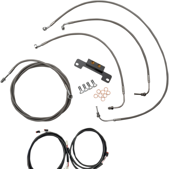 Caracteristicas: Take "cable calculation" headaches out of swapping handlebars Kits give you the correct length cables, brake lines and wire extensions you need so you can complete a handlebar swap Stainless braided kits include throttle cable, idle cable (unless noted), clutch cable, brake lines, chrome "T" brake line junction, banjo bolts, fittings and copper crush washers Made in the U.S.A. Kits are based on using 2" risers with Ape Hanger handlebars