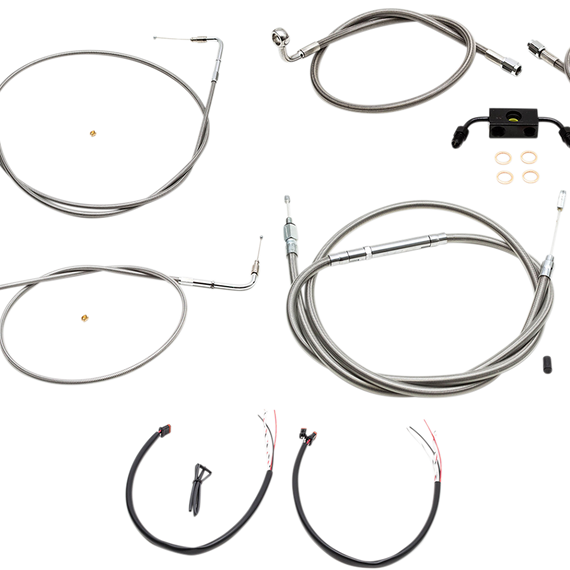 Caracteristicas: Take "cable calculation" headaches out of swapping handlebars Kits give you the correct length cables, brake lines and wire extensions you need so you can complete a handlebar swap Stainless braided kits include throttle cable, idle cable (unless noted), clutch cable, brake lines, chrome "T" brake line junction, banjo bolts, fittings and copper crush washers Made in the U.S.A. Kits are based on using 2" risers with Ape Hanger handlebars