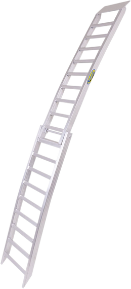 Caracteristicas: Constructed of high-grade aluminum; durable, lightweight and won't rust Top half of ramp is 10" wide, with the bottom half 12" wide which makes an easy transition with loading 1" rungs with ribbed surface for superior traction Continuous arch in ramp is ideal for sport bikes, eliminating low fairings from contacting transition point from ramp to tailgate Heavy-duty tongue with rubber surface helps keep ramp in place on tail gate Secure strap included with cam-lock buckle for easy adjustment Folds in half for easy transportation and storage Measures 89" in length and folds in half Hooking secure strap to transport vehicle helps ramp stay in place and from slipping off tailgate Lightweight at only 16 lb. Maximum distributed load capacity of 750 lb. Do not ride ATV/UTV on ramp at any time.