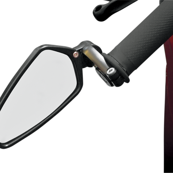 Caracteristicas: Detent hinging allows for added clearance in tight conditions and reduces width for bike storage or transfer Patented aerodynamic design with anodized aluminum housing Unique variable height/width multi-position mounting system CNC-machined from 6061 T-6 billet aluminum Automotive-quality convex mirror glass Stainless steel hardware Universal 7/8" O.D. steel and aluminum handlebar internal adapter Made in the U.S.A.