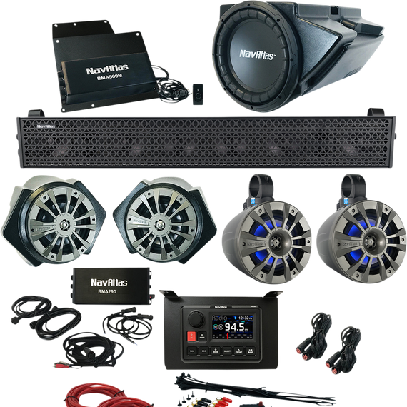 Caracteristicas: Kit includes 3" radio source unit with AM/FM/Weatherband tuner and built-in bluetooth 27” 10-speaker soundbar with built-in 200W class D amplifier 6-1/2” 200W RMS full-range Class-D amplified roll-cage speaker system 2 6-1/2" kick panel 200 Watts RMS speakers with an amplifier 10” 300W subwoofer and enclosure system w/ amplifier and dual amplifier bracket Digital-to-digital cable for connecting amplifier to speakers Installation kit with 60A circuit breaker IP66 rated