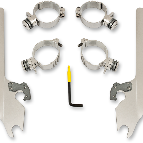 Caracteristicas: Angle Adjustable Model specific no-hassle installation, then on-off without tools A pair of glass-filled nylon latches lock it down until the spring loaded "Trigger-Locks" are intentionally disengaged Made exclusively of electrocoated aluminum and stainless steel, with stainless steel fasteners Anchoring hardware is the same for all windshields and fairings for each bike Made in the U.S.A.