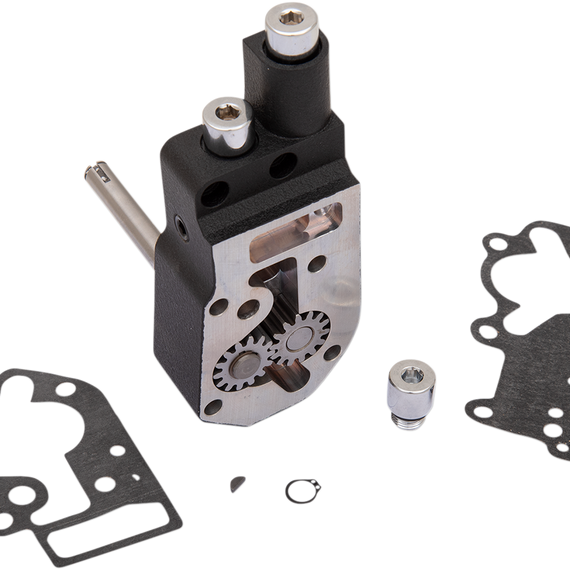 Caracteristicas: Oil pump increases horsepower by decreasing drag on the flywheels and other rotating parts CNC-machined to exact tolerances for the most durable, strong and wear-resistant performance Feed and return gears are individually matched to each body Increases oil return volume over stock pumps OEM-type black wrinkle finish Cover not included Pump only, no hardware Includes pump body, gears, shaft and plugs Made in the U.S.A.