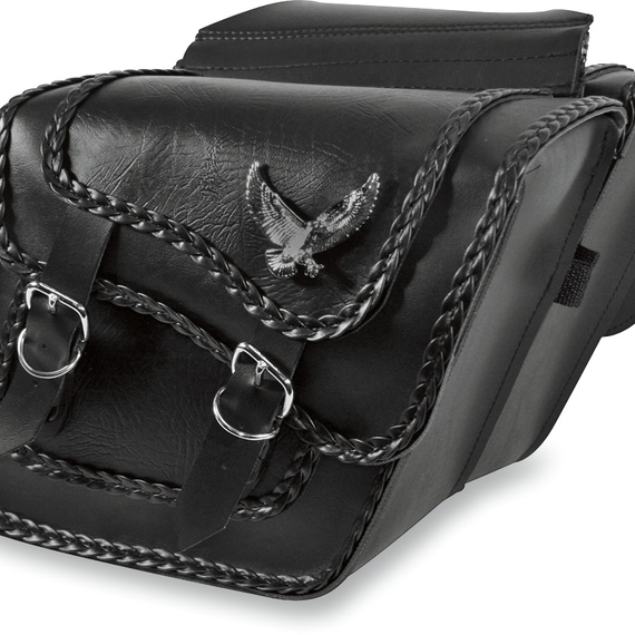Caracteristicas: Black synthetic leather construction with distinctive multigrained inlay Quick-release buckles Zippered yoke assemblies Braided edges and large gold and silver eagle accents Plastic reinforcements help retain shape Include a simple tie-down system Made in the U.S.A. Saddlebag supports are recommended for all saddlebags.