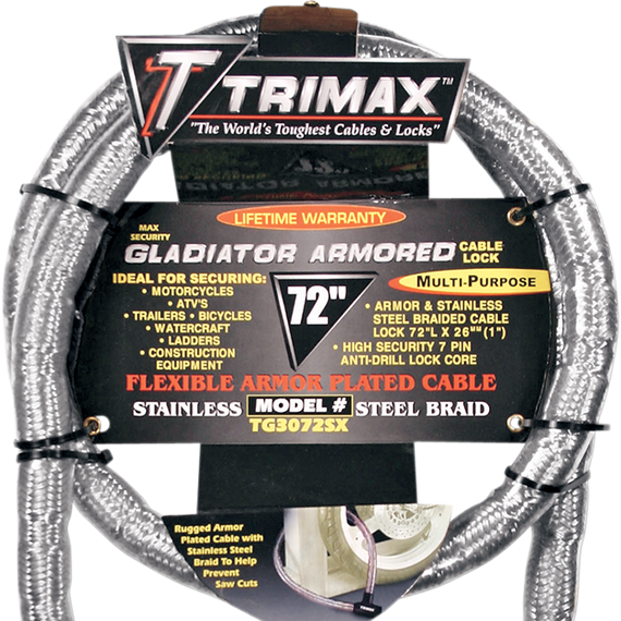 Caracteristicas: Indestructible maximum-security armor-plated cable locks Plastic-covered braided stainless steel covers with patented hardened armor-plated steel cups that repel saw cuts and bolt cutters Flexible for easy transport Ballistic-grade polymer lock housing cover resists hammer strikes; protects lock mechanism Patented key cover resists grime and moisture