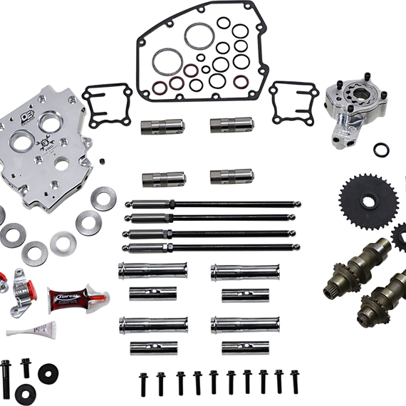 Caracteristicas: Feuling® complete camchest kits include all necessary components from top to bottom of the camchest conveniently packaged under one part # These combination kits not only ensure each individual part is designed to work and function together, but to do so in total harmony These camchest kits take the guess work out of the ordering process and guarantees the engine builder maximum reliability, peak performance and the coolest engine/ oil temperatures obtainable Complete Camchest Kits include: Feuling® High Volume Oil pump, High Flow Camplate, Reaper® series camshafts, hydraulic roller lifters, adjustable pushrods, Timken® bearings, gaskets, O-rings, exhaust gaskets, ARP®fasteners, washers, moly paste, Loctite® and hardware Includes conversion camshafts that updates your old mechanical style cams and tensioners to the new hydraulic tensioner system Includes sprockets, hydraulic tensioners, chains and spacers needed for installation These camshafts utilize the 99-06 inner cam journals with the 07-16 outer cam Cooler engine temperatures Cooler oil temperatures More oil pressure Quieter and smoother engine operation Eliminate wet sumping, blow by and oily air cleaners Designed to increase torque band width and increase fuel economy Great bolt-in camshaft upgrade for stock 88” and 96” engines; also performs very well in 103” strokers Produces strong low- and mid-range power with a linear horsepower and torque curve Can be used with factory valve springs, pushrods and lifters Increases throttle response and eases starting Will also respond well to increased compression and cylinder head work 543 Cam A great camshaft for those who want more top end power than our 525 cam without sacrificing low end torque Extremely smooth cam lobe layout maintains quiet valvetrain and produces the smoothest cruise power band available Excellent bolt-in camshaft for stock to mild 96” and 103” engines and works well in 88” and 95” engines This cam is easy starting, increases throttle response and fuel mileage Responds well to increased compression ratio, performance exhaust and a high flow air cleaner Performance valve springs are required on 99-04 engines and performance pushrods and lifters are recommended but not required Wicked power band for modified engines and an excellent bolt in for stock 96”, 103” and 110” engines Extremely smooth cam lobe design creates a very smooth valve-train motion Responds very well to modified cylinder heads, increased compression ratio, performance exhaust and intake systems Performance valve springs are required on 99-04 engines and performance pushrods and lifters are recommended