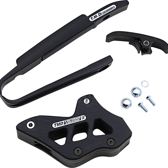 Caracteristicas: The kit includes front slider, lower frame pad & FE #2 rear guide with replaceable wear pad. Noise dampening pad system lowers chain slap noise. A special chain guidance backing plate keeps the chain constantly centered to improve suspension. The lower Powerlip frame pad last longer but more importantly lowers surface drag.
