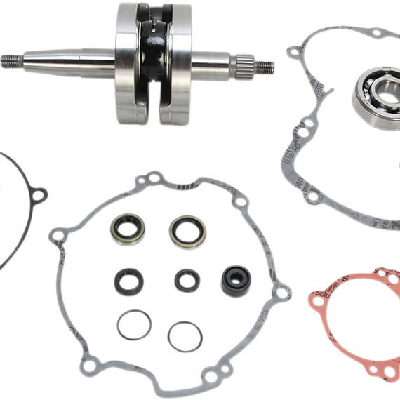 Caracteristicas: Crankshaft kits include crankshaft, top end bearing, premium main bearings and a complete bottom end gasket set that includes all seals and gaskets needed to do the job Only one part number to stock and order Crankshafts are factory assembled and precision trued to OEM specifications Double-forged Wiseco connecting rods maintain superior dimensional consistency through improved grain flow Shot-peening eliminates residual stresses and smoothly blends the rod forging surfaces Corrosion-resistant surface treatment Top and bottom end rod bores case hardened to 58-62 RC to optimize bearing running surface Crank pin bearing radial running clearance is optimized to ensure maximum performance Precision honing ensures ultra round bearing surface Precision-engineered oiling slots maximize rod strength and bearing life Double-drilled small ends provide the piston pin with extra lubrication and cooling, reducing distortion of top end due to thermal transfer from the piston Silver-coated bronze phosphor thrust washers, with dimpled design to increase oil retention and reduce friction between rod and washer interface Crank pin bearings are manufactured from the highest quality hot rolled steel; case-hardened to 58-62 RC Caged needle roller bearings provide the highest possible rpm Precision-machined crank webs Wiseco complete gasket kits are made from premium materials for maximum sealing and reliability; all bearings are OEM-quality for reliability and performance