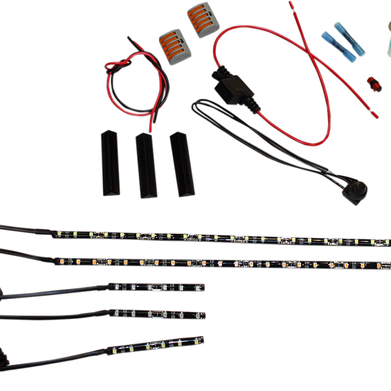 Caracteristicas: 48" color-coded wire in high-temp protective black sheathing Attach with pre-attached 3M adhesive tape High-output 5050 surface-mount single-function LEDs 120° viewing angle 100% waterproof Cruiser kit includes two 24-LED 12" strips, three 6-LED 3" strips, three mounting blocks and complete wiring listed above.