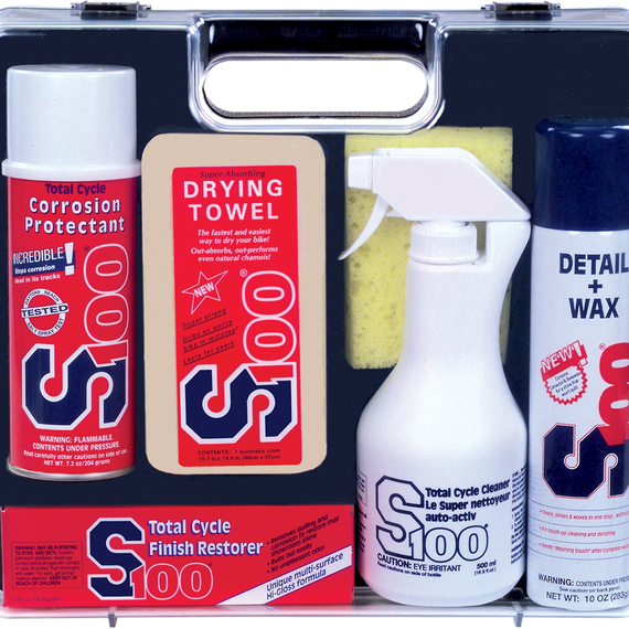 Caracteristicas: A perfectly organized set that contains and organizes the key items a biker needs to keep their steel in the best shape possible Gift pack includes 16.9 oz. of S100 Cleaner, 10 oz. Detail + Wax, 3.56 oz. Finish Restorer, 7.2 oz. Corrosion Protectant, a sponge and an S100 Super Absorbent Drying Towel Packaged in a convenient plastic carrying case with form-fitting polystyrene insert to keep products from shifting Available 4 kits per case