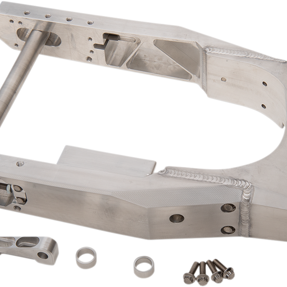 Caracteristicas: Three piece, CNC-machined aluminum swingarm that is bolted, pinned and then welded for maximum strength 7 lb. lighter than a stock swingarm 25 mm chromoly axle with stainless steel adjuster bolts and nuts Accepts stock pivot shaft, bearings, spacers and rubber mounts Adjustable shock mounts Machine finish Made in the U.S.A. This is a highly custom part that will require custom fabrication of some key components, will not accept an OEM brake caliper; a custom caliper and bracket will be required. If converting to a chain drive system, a custom chain slider will need to be fitted to prevent chain wear on the swingarm. Will require the use of a rear wheel that accepts a 25 mm axle.