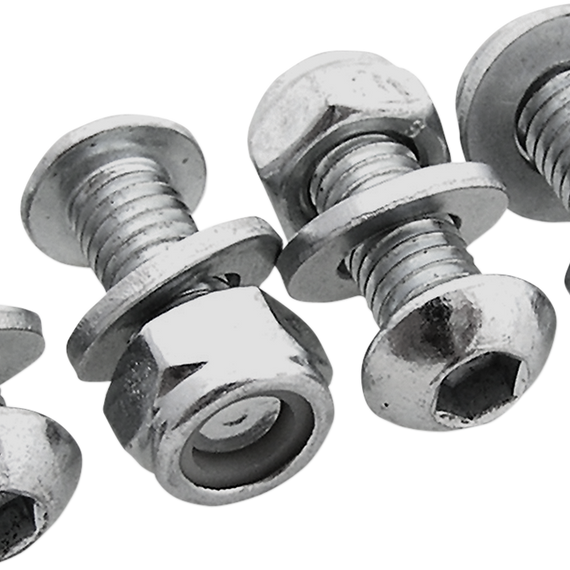 Caracteristicas: Basic license plate fastener kit Includes four bright zinc-plated button-head bolts for a clean look Nylon locking nuts stay tight under vibration Includes washers Made in the U.S.A.