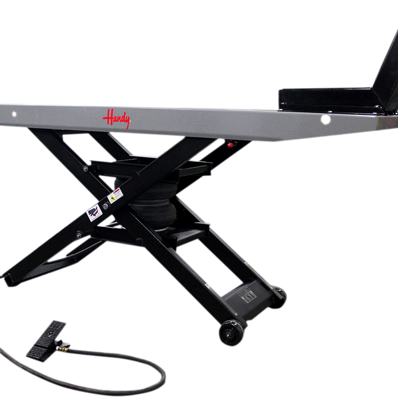 Caracteristicas: Ideal for working on motorcycles, ATVs, snowmobiles and other large vehicles Convenient foot valve allows easy up/down Ramp measures 30" Lowers to a minimum height of 8" Air lift power is 90-100 psi Made in the U.S.A.