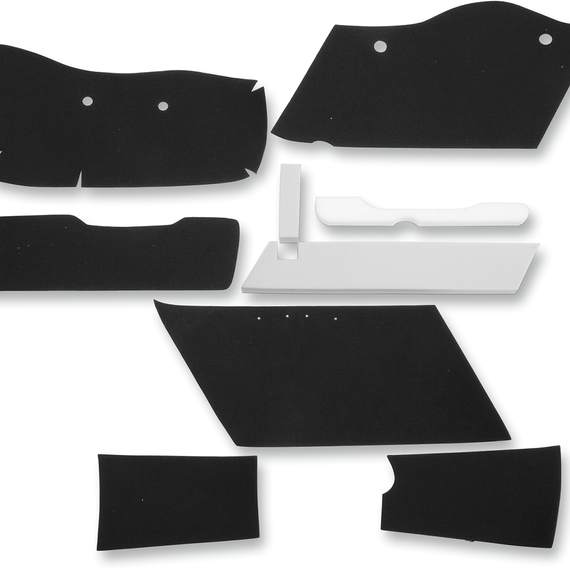 Caracteristicas: Lining kit designed for extended-size saddlebags Automotive-grade carpet materials Mildew and moisture-resistant treated Material has a pressure-sensitive adhesive on the back Precut to size Includes precut foam pieces and rigid panel to create a smooth flat bottom Also includes precut panels for HD OEM-style lids Easy peal-and-stick application Instructions included Made in the U.S.A.