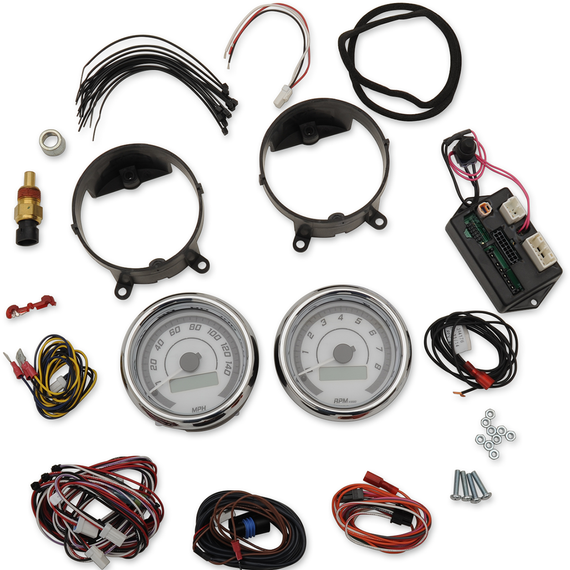 Caracteristicas: New MVX Series Analog/Digital Bagger Gauges offer two bezel options, four background choices, and seven lighting colors to choose from - the combinations are nearly endless Whether installing a six-gauge set, or building your perfect gauge set from Dakota Digital's optional gauges, you will get all seven gauge readings displayed in the speedometer and tachometer LCD readouts (speed, rpm, volts, fuel, oil pressure, oil temp, and air temp), as well as miles to empty, and performance readouts (0-60 time, and quarter-mile speed and time) Personalize your gauge set by programming the pointer, backlight, and LCD message center colors independently Six-gauge kits include speedometer, tachometer, oil pressure, oil temperature, fuel level, and voltmeter Two-gauge kits include speedometer and tachometer (will display other gauge readouts in odometer) Optional fuel level gauges, oil pressure gauges, oil temperature gauges and voltmeter can only be used with MVX six- and two-gauge kits; they will not work alone Seven user-selectable LED lighting colors available for background, message, and pointer: red, green, blue, teal, magenta, amber or white Proudly designed and manufactured in the U.S.A. Plug directly into the MVX and MCL-3014 series gauges and add readings for up to two air suspension pressure, boost pressure, or compass heading into the existing LCD displays of the speedometer and tachometer This makes it extremely easy to add these gauge readings without having to remove any of your existing MVX gauges