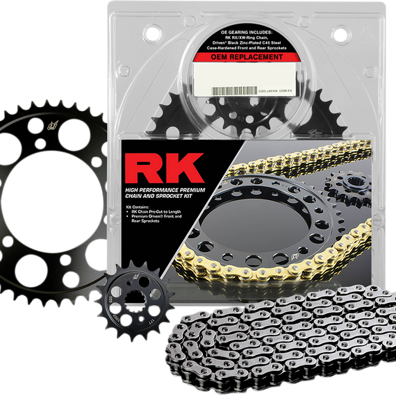 Caracteristicas: Kit includes a premium Driven® C45 steel alloy black case-hardened rear sprocket paired with Driven® C45 steel case hardened and quenched front sprocket Kit contains OE Gearing RK’s OEM Replacement kit is designed as high-mileage performance kit