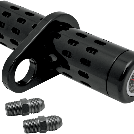 Caracteristicas: CNC-machined from billet aluminum Kits mount to frame tubes with supplied clamps and reducers Come with AN #6 fittings (use with -6 lines found in most speed shops) If using standard 3/8" hose, use a breather fitting Measure 12" L x 2.25" diameter Replacement clamps available separately Twin Cam models require an oil filter adapter or offset mount w/ oil line fittings