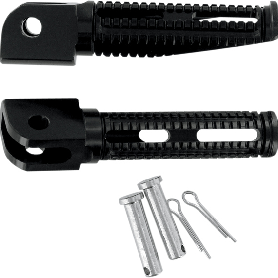 Caracteristicas: CNC-machined from 6061 T-6 billet aluminum; replace stock footpegs Lighter than stock, slash cut for greater ground clearance; have machined, not knurled, grooves for better grip