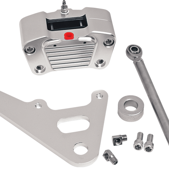 Caracteristicas: Raw metal on black contrast calipers is anodized for a long-lasting high-quality finish Two piston designs for various H-D models (including rigid frames) Hanger brackets and brake pads included For use with 11.5" rotors Made in the U.S.A. The OLD-STYLE Wagner and Kelsey-Hayes (die-cast aluminum OEM) on rear applications have a 3/4" bore master cylinder and WILL NOT WORK CORRECTLY. Not recommended for use with imported stainless steel rotors. Requires use of 5/8" bore master cylinder.