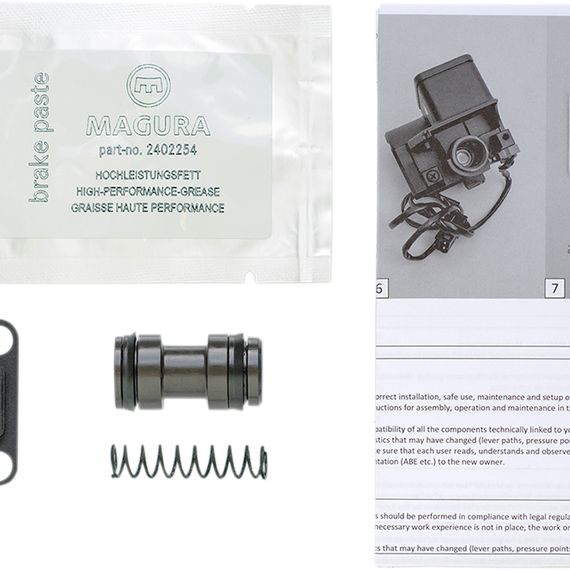 • Kit includes piston with seals and spring, piston bellows, container bellows, sealing ring for piston mounting screw and silicone brake paste