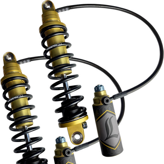 Caracteristicas: Available in Black, Gold and Clear Type III Hard-coat Anodize Legend's touring specific spring rates produce superior ride quality and performance REVO coils provide improved plush ride quality, control, and resistance to bottoming-out REVO's extended coil length has larger "sweet spot" without increasing overall shock length Allows minimal pre-load adjustments by hand when changing between riders' weights or loads Adjusts by hand, no tools needed Available in 13" and 14", standard or heavy-duty applications Easy installation and alignment, provided by spherical bearings on both top and bottom 35 mm monotube construction Deflective disc valve stacks Balanced/Matched piston and base-valve design specific for these motorcycle applications Low friction sealing system and PTFE based sliding bearings for improved performance and feel Seven external knob adjustments allow fine-tuning of rebound Seven external knob adjustments allow fine-tuning of compression Provides optimum rebound and compression performance for any given rider weight, personal ride quality preference, or personal riding style Nitrogen gas bladder design allows ultra-fast response and stiction-free movement Light to heavy riders can fine-tune ride preference Aggressive to casual riding styles can tune to desired quality or personal preference P65 WARNING: Cancer and Reproductive Harm Lifetime Warranty Made by hand in Sturgis, SD USA FL: Heavy Duty applications are recommended for 500lb. + rider and passenger total weight. DYNA, FXR, SPORTSTER: Heavy Duty application are recommended for 250lb.+ rider and passenger total weight. Also consider Heavy Duty if the majority of your riding is 2-UP, stunt riding, or aggressive riding style.