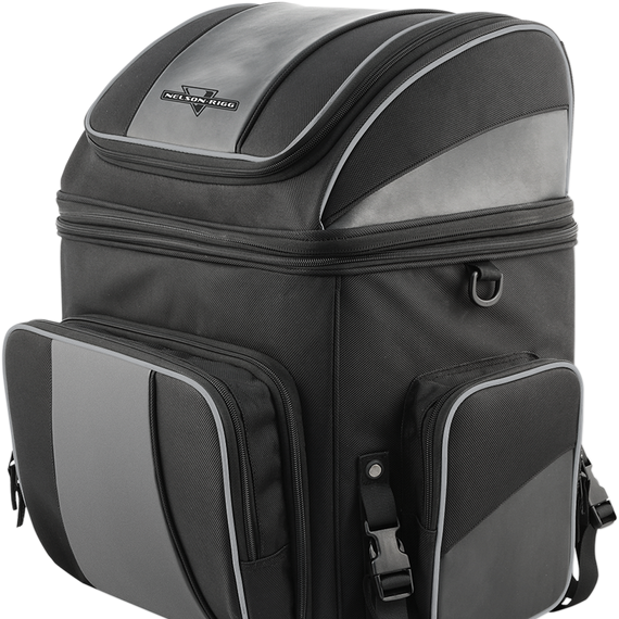 Caracteristicas: Industry leading UltraMax™ fabric with maximum UV protection Mounts to luggage rack, sissy bar or passenger seat with quick release and self-fastening straps Large lower and smaller top divided storage compartments with lockable zippers Front pocket folds down to access main storage Zippered divider in top section converts entire bag one massive compartment Additional 3” expansion section for extra storage Three outside pockets for quick access items Fully lined interior with rigid construction Solid floor panel to prevent sagging Carrying handle for easy transporting when off the bike Heavy-duty lockable zippers with pull fobs for use with gloves Reflective piping for increased visibility Waterproof rain hood included Getaway dimensions- Main compartment: 12”L x 9”W x 12”H  21 liters - Top compartment: 11”L x 8”W x 3 ”H  7 liters Destination dimensions - Main compartment: 15”L x 12”W x 12”H  35.5 liters - Top compartment: 15”L x 12”W x 6”H  18 liters