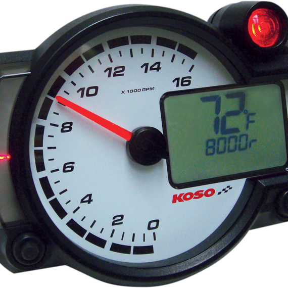 Caracteristicas: Easy-to-read gauge with dial-type tachometer and digital display 0-16000 rpm range; light point shows max rpm that is regularly reached Digital display shows tachometer and thermometer Programmable shift light Adjustable high temperature warning Keeps record of max rpm and top temperature Measures 100.7mm (4”) H x 135.7mm (5.35”) W x 52mm (2.05”) D Includes gauge bracket and temperature sensor