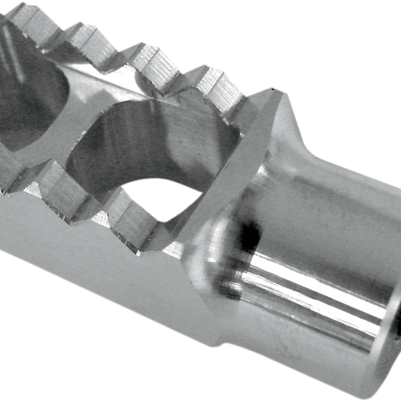 Caracteristicas: Give your bike a unique design twist with these all-billet aluminum adjustable serrated footpegs Fully CNC-machined from solid 6061 T-6 bar The comfortable serrated foot surface area provides a good "bite" onto the bottom of your shoe Serrated shift pegs have serrations on the top surface only, and the bottom side is smooth to provide non-shoe-damaging up-shifts - installs easily to most stock H-D shift arms with a threaded 5/16"-24 mounting hole New ribbed shift peg is our round version of the serrated peg - smooth round surface won't scuff the surface or heel of the boot when shifting the bike Made in the U.S.A.