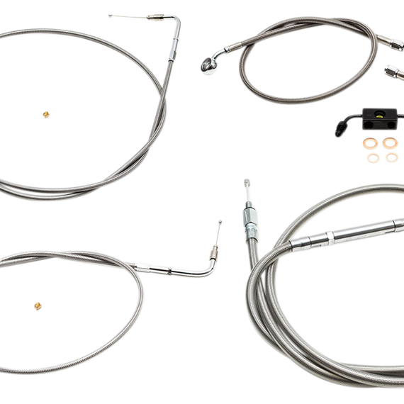 Caracteristicas: Take "cable calculation" headaches out of swapping handlebars Standard kits include the correct length brake/clutch lines and wire extensions to complete a handlebar swap; electrical wire extensions not included (available separately) Standard kits include clutch line, brake lines, chrome "T" brake line junction, banjo bolts, fittings and copper crush washers Made in the U.S.A. Kits are based on using 2" risers with Ape Hanger handlebars