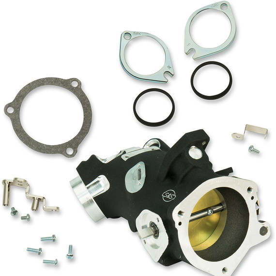 Caracteristicas: Requires throttle body specific Stealth air cleaners (available separately) for 58mm and 66mm bodies Sealed, stainless steel throttle shaft with dual roller bearings for smooth operation and no air leaks One-piece throttle body/manifold design for easy installation and stock appearance Compatible with stock sensors, fuel rail and throttle cables Throttle bodies include hardened steel flanges and seals Black powder coat finish matches stock More air flow for improved performance Made in the U.S.A. Some S&S heads have additional material on the manifold surface to allow the use of a stock length manifold (405) on a 124" engine. If you are not sure which manifold should be ordered, check fitment with the stock manifold first.