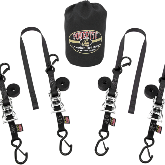 Caracteristicas: 1" wide industrial-grade PowerTye ratchet Black webbing Soft-Tye sewn in 4,500-lb. test nylon webbing Vinyl-coated latch hooks Double-security stitching 700-lb. working load 6-1/2' length Includes two pair 1" PowerTye ratchet tie-downs and heavy-duty Cordura® storage bag with zipper top closure Made in the U.S.A.