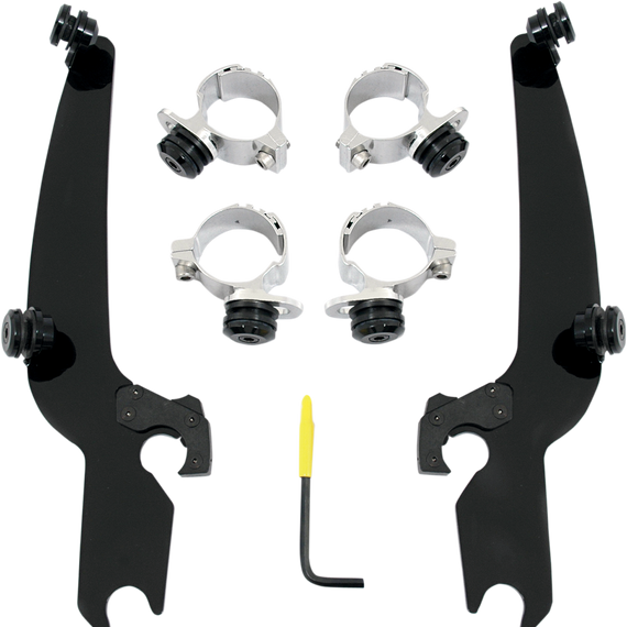 Caracteristicas: The revolutionary No-Tool Trigger-Lock mounting kits feature a detach system that allows you to quickly and easily remove or swap out your Sportshield without the use of any tools A pair of latches lock the windshield down until the spring loaded "trigger locks" are intentionally disengaged, allowing the rider to remove the windshield Kits are a combination of CNC-machined aluminum plates and anchors, stainless steel hardware, gray polymer bushings and glass-filled nylon latches or "Night Shades" black version which, is a gradient black windshield with black E-coated stainless steel straps, fittings and hardware for a black-on-black sinister look Kits are custom-fit to each style of bike for no-hassle installation