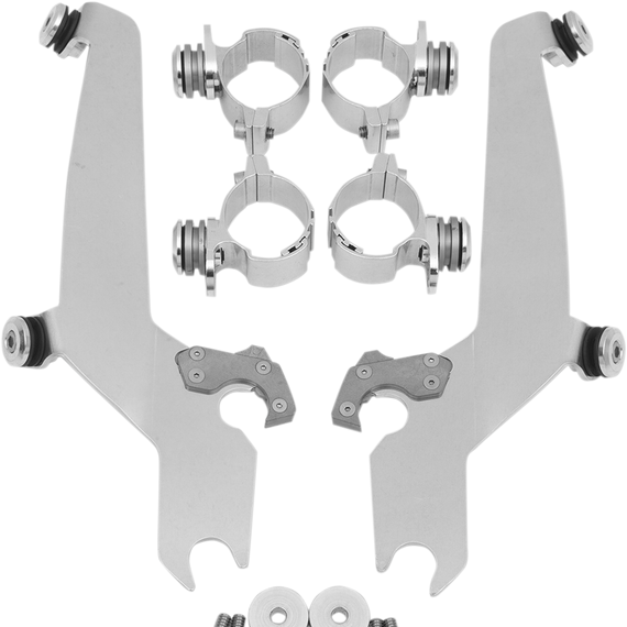 Caracteristicas: The revolutionary No-Tool Trigger-Lock mounting kits feature a detach system that allows you to quickly and easily remove or swap out your Sportshield without the use of any tools A pair of latches lock the windshield down until the spring loaded "trigger locks" are intentionally disengaged, allowing the rider to remove the windshield Kits are a combination of CNC-machined aluminum plates and anchors, stainless steel hardware, gray polymer bushings and glass-filled nylon latches or "Night Shades" black version which, is a gradient black windshield with black E-coated stainless steel straps, fittings and hardware for a black-on-black sinister look Kits are custom-fit to each style of bike for no-hassle installation