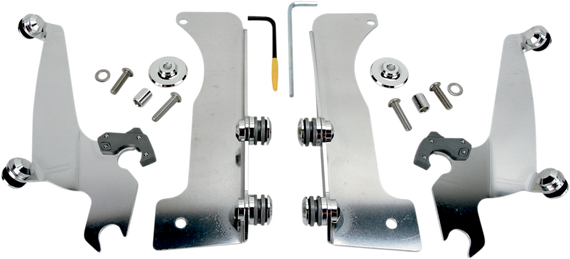 • Kits are a combination of CNC-machined aluminum plates and anchors, stainless steel hardware, gray polymer bushings and glass-filled nylon latches or "Night Shades" black version which, is a gradient black windshield with black E-coated stainless steel straps, fittings and hardware for a black-on-black sinister look