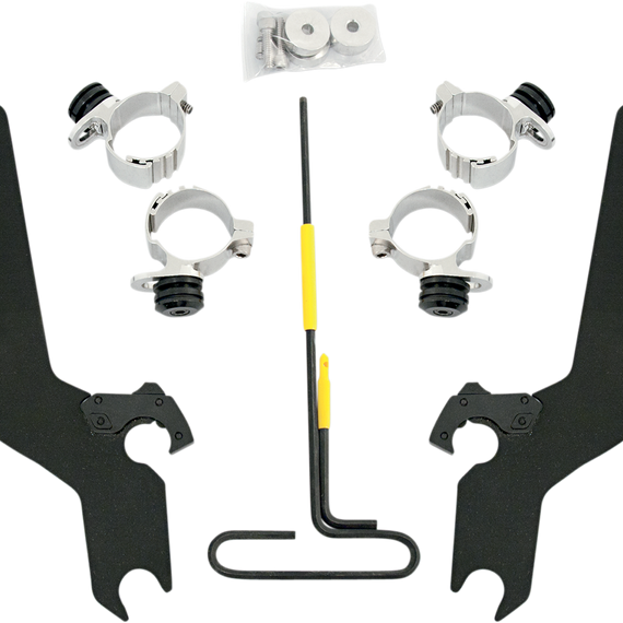 Caracteristicas: The revolutionary No-Tool Trigger-Lock mounting kits feature a detach system that allows you to quickly and easily remove or swap out your Sportshield without the use of any tools A pair of latches lock the windshield down until the spring loaded "trigger locks" are intentionally disengaged, allowing the rider to remove the windshield Kits are a combination of CNC-machined aluminum plates and anchors, stainless steel hardware, gray polymer bushings and glass-filled nylon latches or "Night Shades" black version which, is a gradient black windshield with black E-coated stainless steel straps, fittings and hardware for a black-on-black sinister look Kits are custom-fit to each style of bike for no-hassle installation