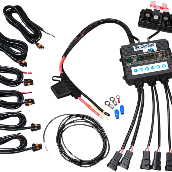 Caracteristicas: Control box: 6 channels, 2 x 30 amp circuits, 2 x 10 amp circuits, 2 x 5 amp circuits, All Solid State, 12-24 volt RF Remote switch pad usable inside or outside the vehicle Bluetooth control from phone/tablet app Manual buttons for on/off on top of case DIN connector built in for manual control with conventional toggle switches (harness sold separately) Low voltage cutout to shut down Trigger if battery voltage gets low 100 amp fuse installed on positive input wire for protection 12 to 24 volt out with waterproof connectors Fuse’s built in, waterproof cover (30 amp - 1 and 2, 10 amp - 3 and 4, 5 amp - 5 and 6) LED’s to indicate relay on and if fuse is blown, blue for circuit on, red for blown fuse Waterproof case design, withstands temps to 250 deg. F and -20 deg. F below freezing 12 to 24 volt input, 3 wires, ground, switched positive, battery positive RF Remote: 2.4 ghz frequency hopping RF connection to control box Replaceable battery power and/or 12 volt hardwired option for backlit switches Back lit with press of button, delayed off for the back light. If hardwired, provides a color changing option adjustable from App Back lights stay lit when vehicle lights are on Custom switch labels included Weatherproof design App Control: Apps for both Android and iOS with simple interface for turning on and off the 6 channels Allows customized names for each channel Battery voltage shows in App screen Controls backlight color in the RF switch pad App allows for dimming and strobe functions in addition to ON/OFF Harnesses: Kit includes six 8’ wire harnesses with the mating connector to the control box on one end and blank wires on the other; Two 12 gauge, two 14 gauge, two 18 gauge