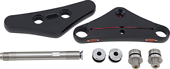 Caracteristicas: CNC-machined from aircraft-quality billet aluminum Includes fork tube plugs that allow for a clean, finished look on the top of the triple tree Triple trees are pre-drilled to mount the Pro-One Hide Away internal fork stop kits Includes handlebar dampers with chrome billet caps, a fork stem, and all the necessary mounting hardware Accepts 41 mm fork tubes Raked triple trees change handling characteristics of motorcycle. Steering geometry must be calculated to determine which degree of rake is most suited for application. Trees with more than 3° of rake should not be used in stock frame applications.