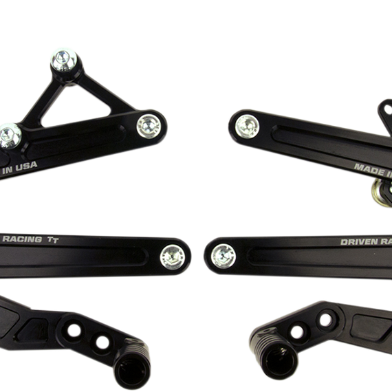 Caracteristicas: Race-inspired design All rearsets feature high-grade hardware, folding shift/brake pegs and standard or reverse shift pattern options Footpeg plate has a small window that shows peg adjustment value and conceals all mounting holes not in use Anodized black finish