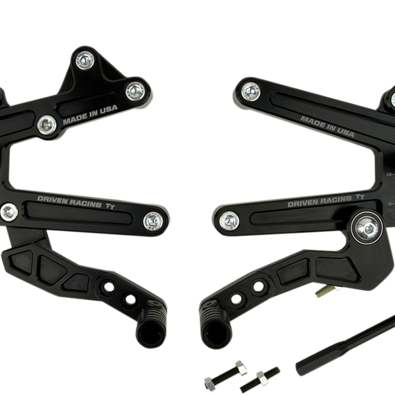 Caracteristicas: Race-inspired design All rearsets feature high-grade hardware, folding shift/brake pegs and standard or reverse shift pattern options Footpeg plate has a small window that shows peg adjustment value and conceals all mounting holes not in use Anodized black finish