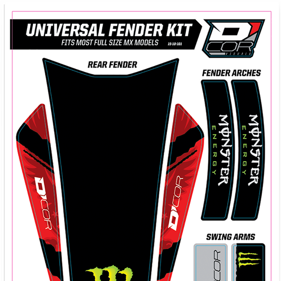 Caracteristicas: Fits most MX full size models Includes graphics for front fender, rear fender, fender arches and swingarm 15 mil decal thickness